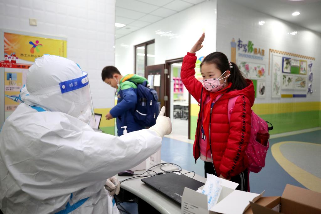 12月16日晚,在西安市浐灞生态区一小学核酸检测点,一名小学生在采集核酸样本后,向西安中医脑病医院的医护人员敬少先队礼,用自己的方式表达谢意。新华社发 张丽姝摄