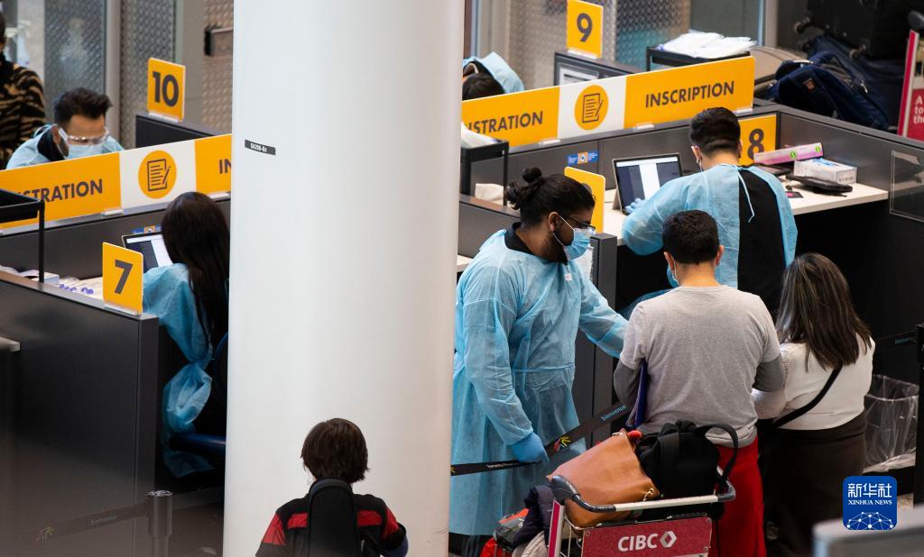 12月21日,在加拿大多伦多皮尔逊国际机场的新冠检测站,身穿防护服的工作人员帮助入境旅客登记。新华社发(邹峥摄)
