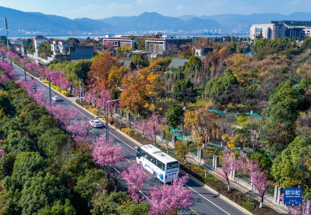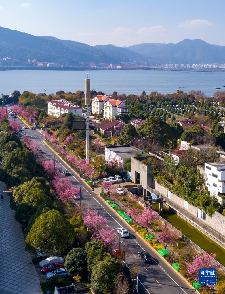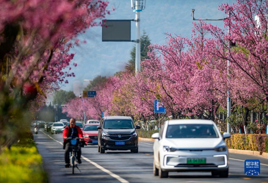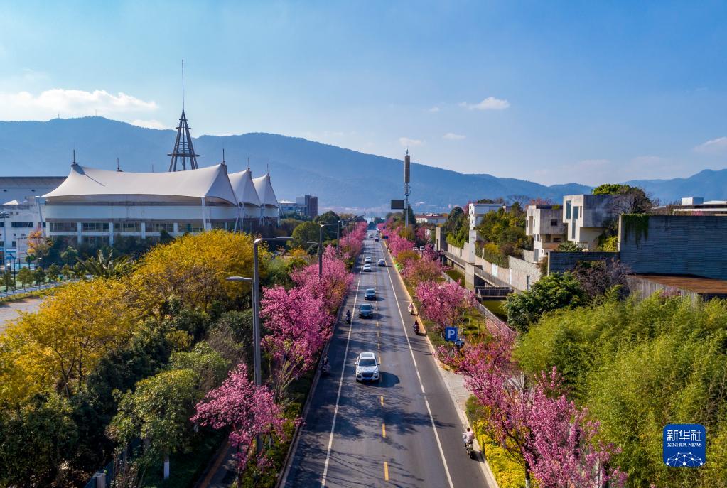 当日,云南省昆明市阳光明媚。在昆明市一些路段,道路旁种植的冬樱花在蓝天下绽放,美景如画。
