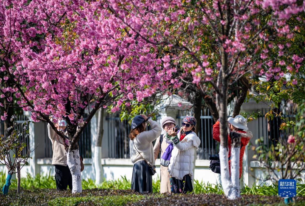 12月21日,游客在昆明市红塔西路观赏冬樱花。新华社记者 陈欣波 摄
