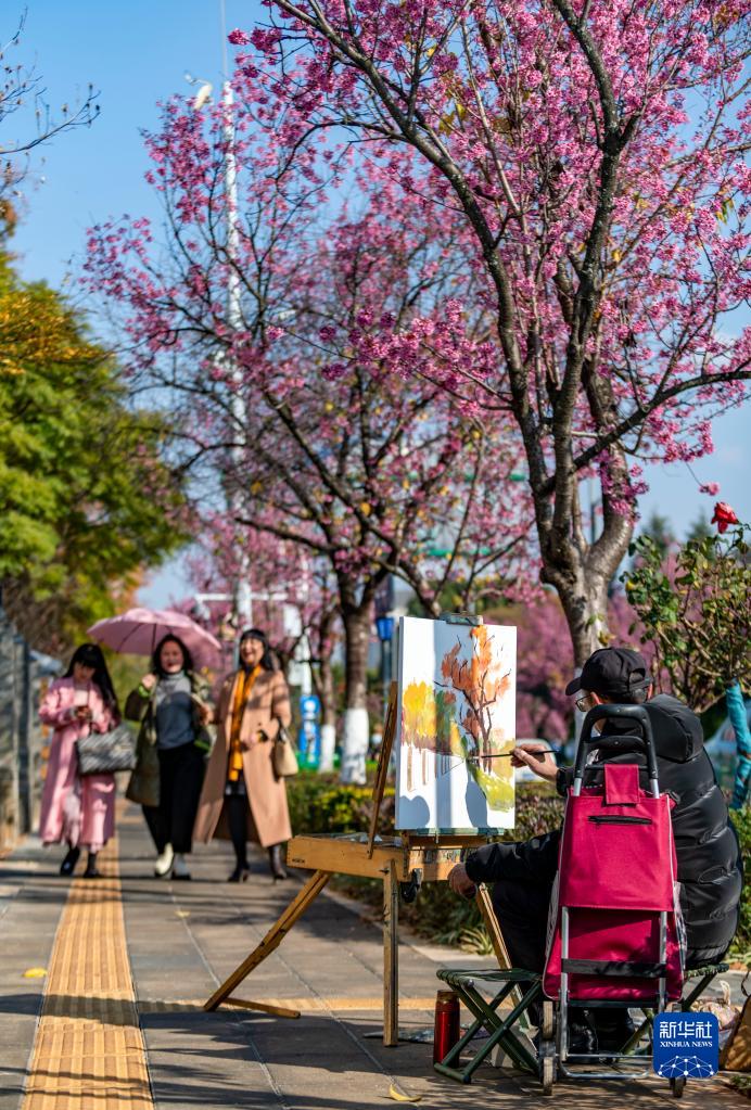 12月21日,一名游客在昆明市红塔西路绽放的冬樱花下写生。新华社记者 陈欣波 摄