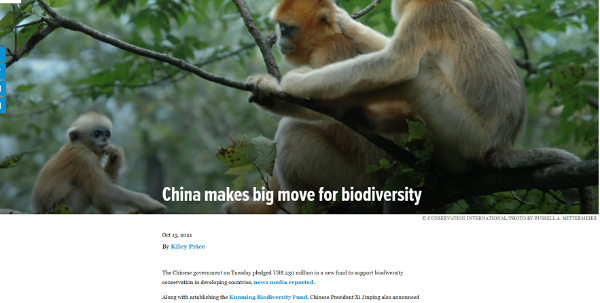 国际环保组织保护国际基金会(Conservation International)13日在官网发表文章称,中国在生物多样性方面迈出了重大步伐。