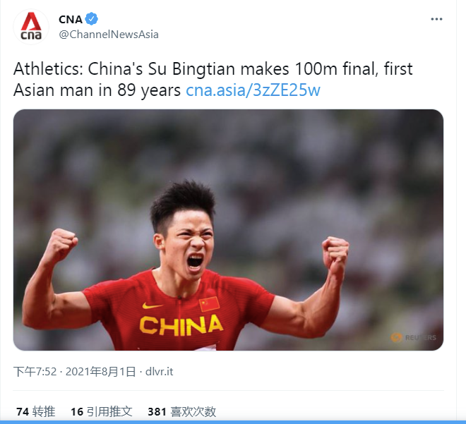 新加坡《海峡时报》报道直呼,苏炳添真是太酷了!他让世界感受到了亚洲速度。文章说,苏教授在半决赛中跑得太快了,他让我们相信亚洲人也能飞起来。