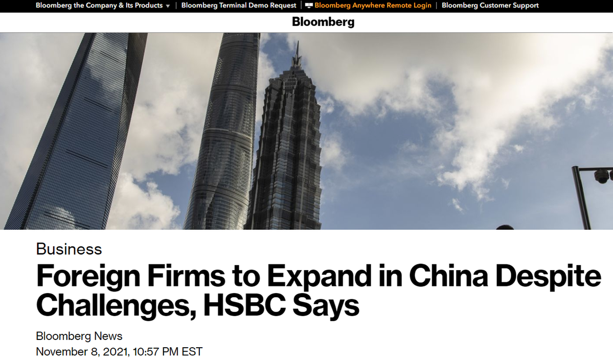 彭博社报道称,汇丰银行对2174家外资企业的调查显示,97%的受访企业表示,他们打算继续扩大在华投资,因为中国拥有庞大的市场、经济持续增长的预期以及发达完善的供应链。其中19%计划将25%以上的盈利投资于中国,另有42%计划将11%至25%的利润投资于中国。