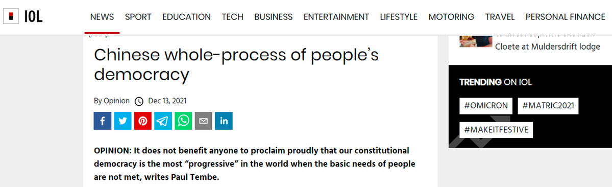 南非大学姆贝基非洲领导力研究院高级研究员谭哲理(Paul Tembe)在南非独立在线新闻网站(IOL)发表评论文章,积极评价中国的全过程人民民主,认为中国的民主制度实现了良政善治,南非可以从中学习借鉴以更好服务本国人民。