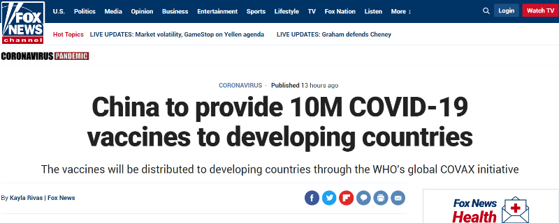 美国福克斯新闻网2月3日报道,应世卫组织方面请求,中方决定向“新冠疫苗实施计划”(COVAX)提供1000万剂新冠疫苗,主要用于发展中国家急需。