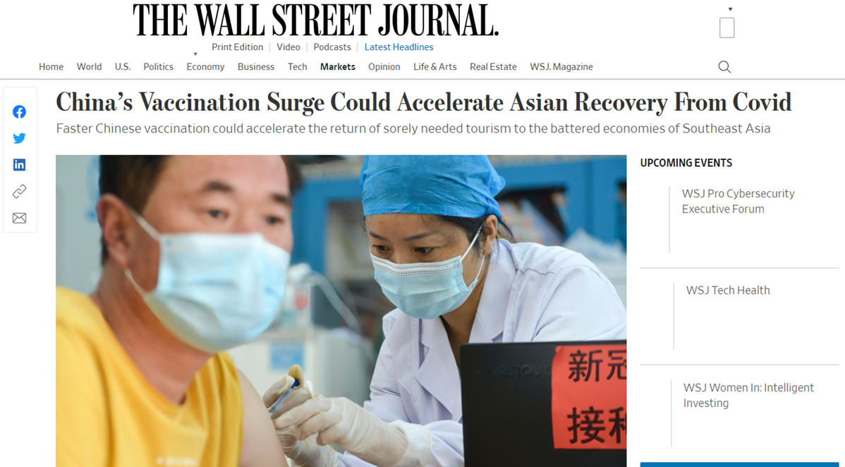 《华尔街日报》5月报道称,中国疫苗接种速度不断突飞猛进,如能保持该速度,将有望改变人们对亚洲乃至全球新兴市场复苏速度的预期。