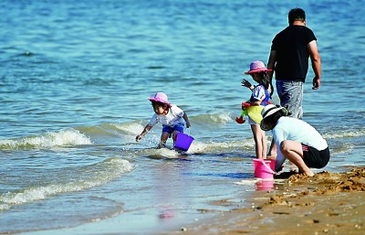 在天津市滨海新区的人工沙滩,小朋友体验“赶海拾贝”。新华社发