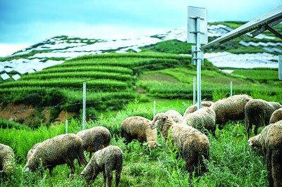 贵州威宁的居民在仙水窝光伏电站放养的羊群。新华社发