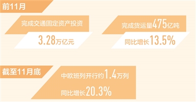 今年以来,为应对国际物流供应链循环不畅,交通运输部与有关部门高效协作。截至11月底,中欧班列开行约1.4万列、同比增长20.3%,国际货运航班开行7.4万班、同比增长25.8%。
