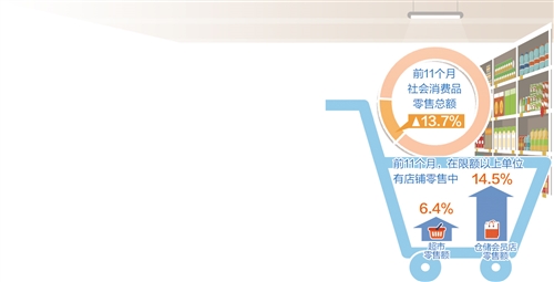 今年11月份的消费数据显示,超市等实体零售业态增速加快。国家统计局贸易外经司统计师付加奇表示,前11个月,在限额以上单位有店铺零售中,超市、仓储会员店零售额同比分别增长6.4%和14.5%,增速分别比前10个月加快0.4个和1个百分点;便利店零售额增速与前10个月份持平,仍保持两位数较快增长。