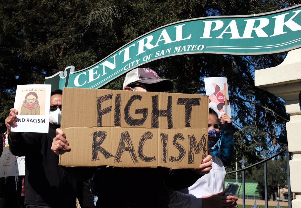 2月27日,在美国加利福尼亚州旧金山湾区圣马特奥市,人们参加集会反对针对亚裔的歧视行为和仇恨犯罪。(新华社记者吴晓凌摄)