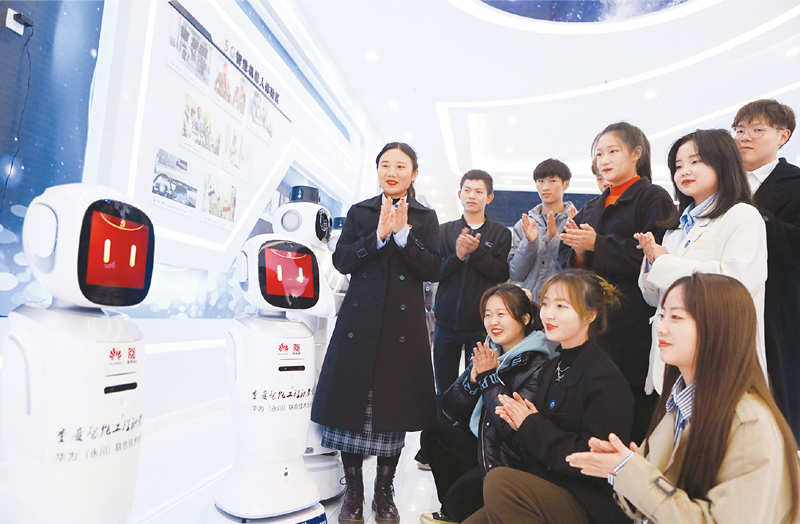2021年11月13日,重庆智能工程职业学院校园内,智能机器人“大华”、“大智”向学生们普及党的十九届六中全会精神,其可爱的形象和声音,深受学生们的喜爱。人民图片 陈仕川/摄