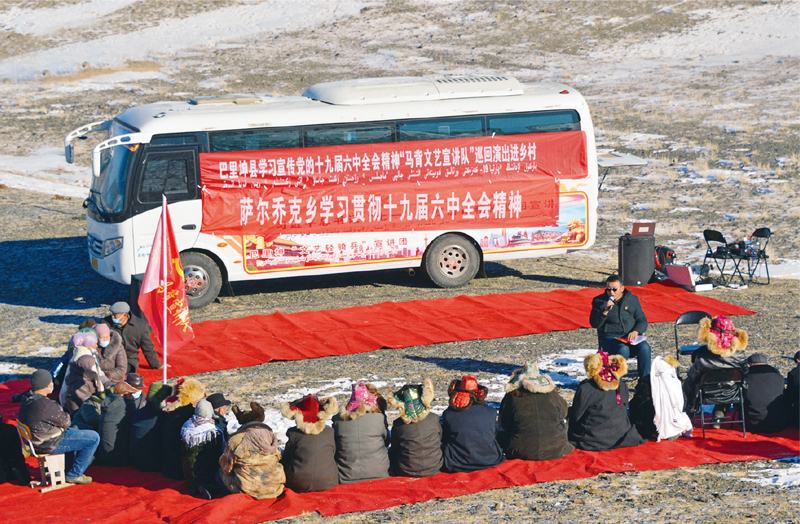 新疆巴里坤哈萨克自治县组建“马背文艺宣讲队”,深入边远农牧区乡村开展党的十九届六中全会精神巡回宣讲。图为2021年12月1日,宣讲队给冬牧场的哈萨克族牧民宣讲全会精神。 人民图片 张建刚/摄