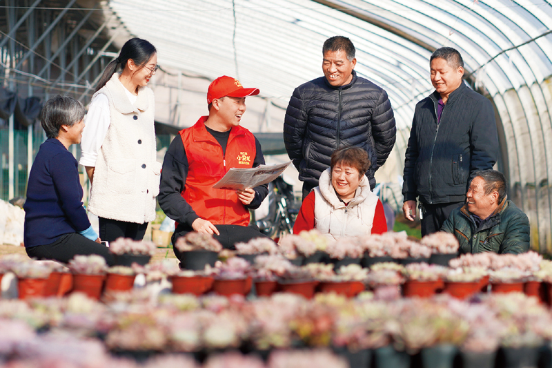 河北省邢台市内丘县组织六十二支“小马扎”宣讲小分队深入到社区、学校、农村和企业,利用快板、诗歌、说唱等群众喜闻乐见的形式开展宣讲活动,把党的十九届六中全会精神送到群众家门口。图为2021年11月23日,“小马扎”宣讲小分队队员在马涧村花卉大棚宣讲全会精神。 人民图片 刘继东/摄