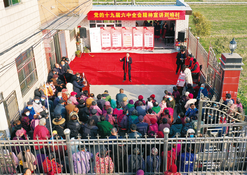 2021年12月5日,江苏省海安市曲塘镇群贤村开展“党的十九届六中全会精神宣讲到咱村”活动,通过百姓名嘴宣讲、文艺表演、诗朗诵等形式,向群众宣传全会精神。人民视觉 姜明/摄