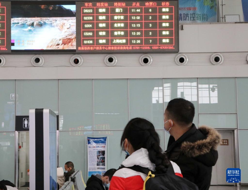 1月2日,旅客在福州火车站候车厅观看大屏幕播放的主题歌曲《领航》MV。新华社发(李一明 摄)