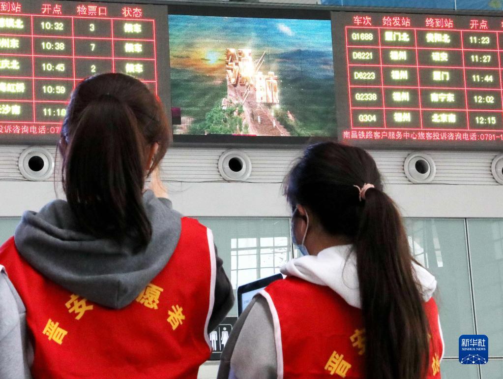 1月2日,青年志愿者在福州火车站候车厅观看大屏幕播放的主题歌曲《领航》MV。新华社发(李一明 摄)