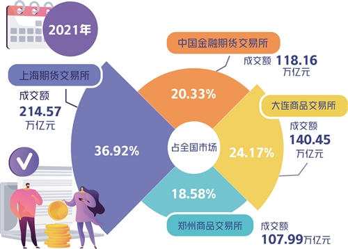数据显示,上海期货交易所2021年成交量为24.45亿手,成交额为214.57万亿元,同比分别增长14.9%和40.4%,分别占全国市场的32.55%和36.92%。