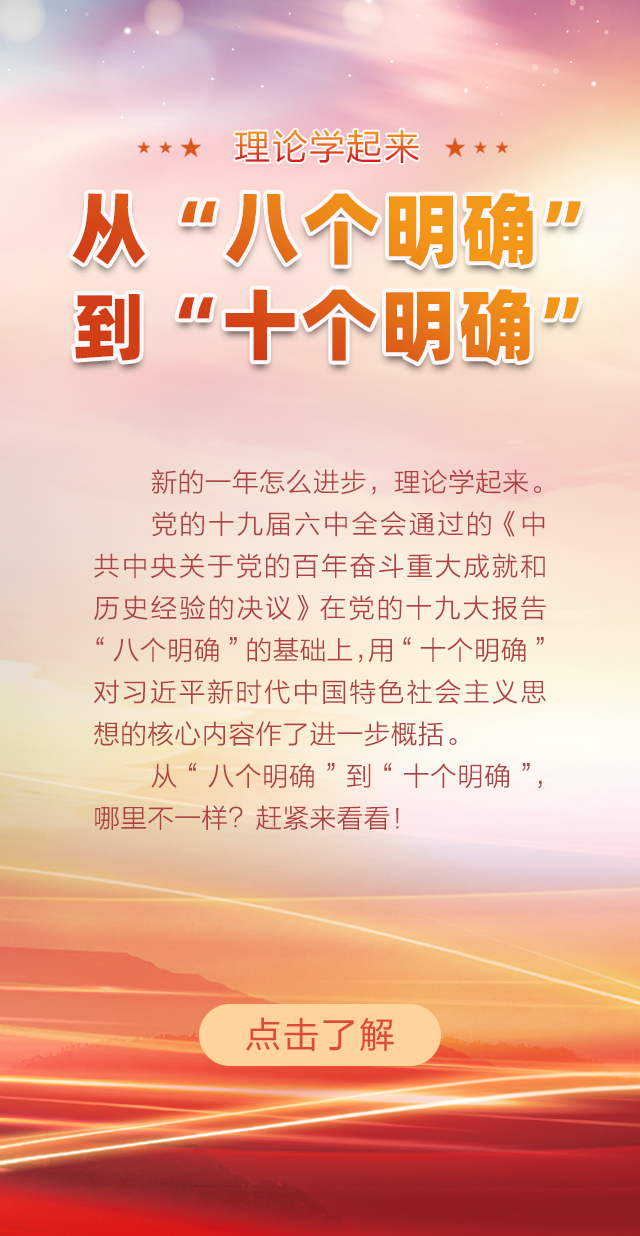 党的十九届六中全会通过的《中共中央关于党的百年奋斗重大成就和历史经验的决议》在党的十九大报告“八个明确”的基础上,用“十个明确”对习近平新时代中国特色社会主义思想的核心内容作了进一步概括。
