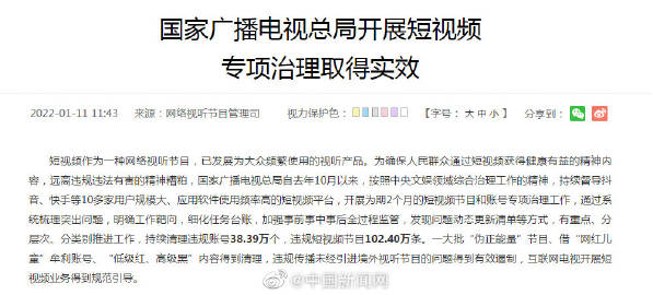 国家广播电视总局11日发文称,自去年10月以来,按照中央文娱领域综合治理工作的精神,持续督导抖音、快手等10多家用户规模大、应用软件使用频率高的短视频平台,开展为期2个月的短视频节目和账号专项治理工作,持续清理违规账号38.39万个,违规短视频节目102.40万条。一大批“伪正能量”节目、借“网红儿童”牟利账号、“低级红、高级黑”内容得到清理,违规传播未经引进境外视听节目的问题得到有效遏制,互联网电视开展短视频业务得到规范引导。