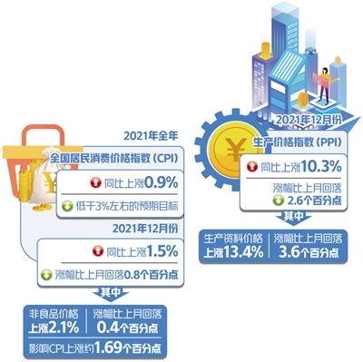国家统计局1月12日发布数据,2021年全年,全国居民消费价格指数(CPI)前低后稳,比上年上涨0.9%,低于3%左右的预期目标,物价调控目标顺利完成;工业生产者出厂价格指数(PPI)冲高回落,平均上涨8.1%。