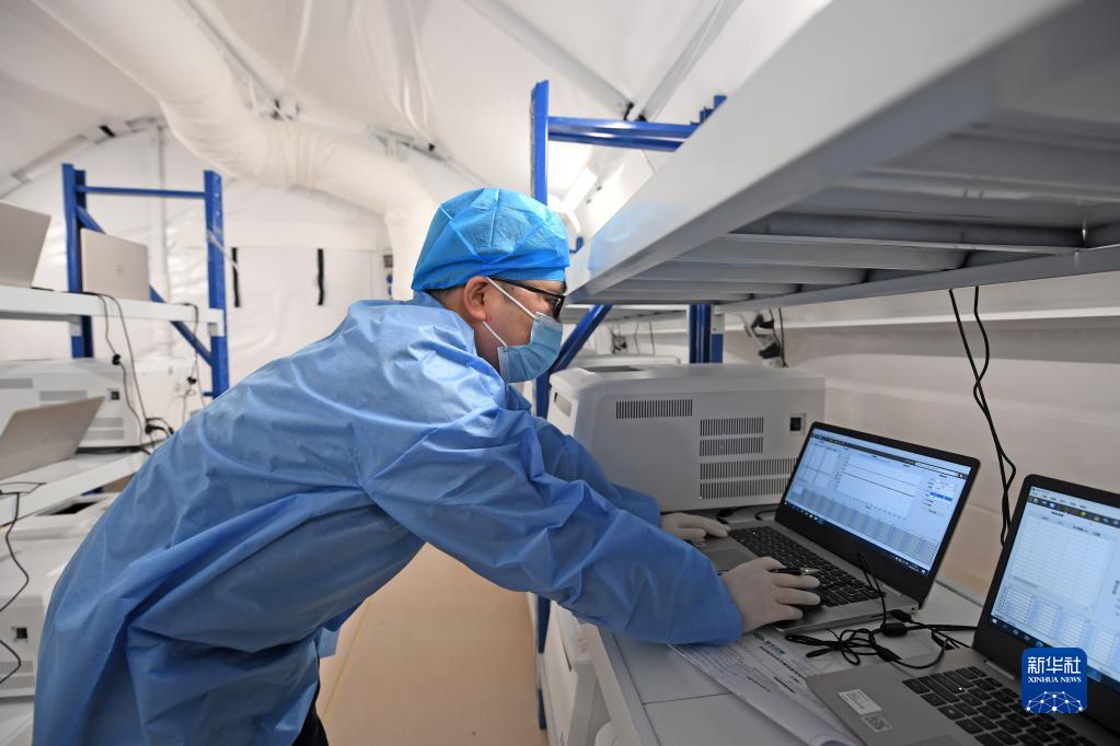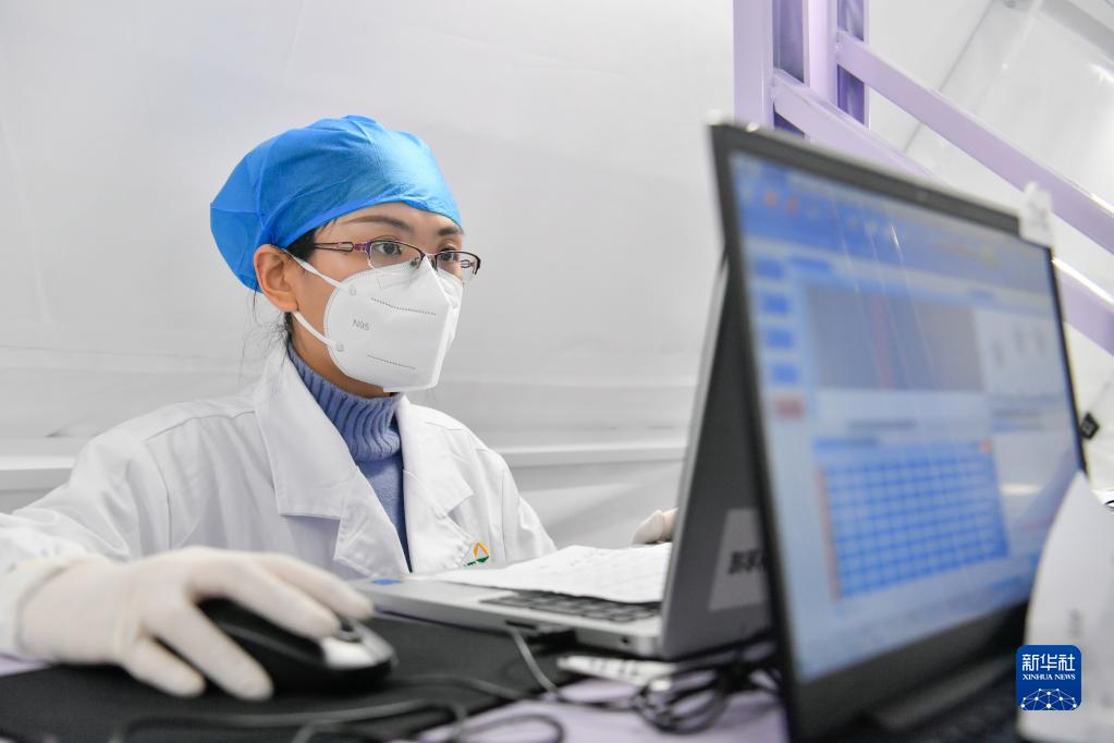 1月13日,在天津市北辰区某高校,气膜实验室工作人员在扩增分析区分析核酸样本数据。