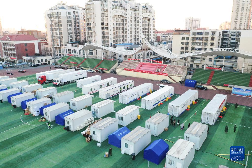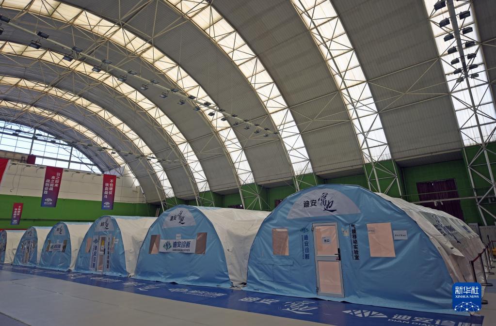 这是1月12日拍摄的位于天津市滨海新区塘沽体育场内的方舱实验室(无人机照片)。