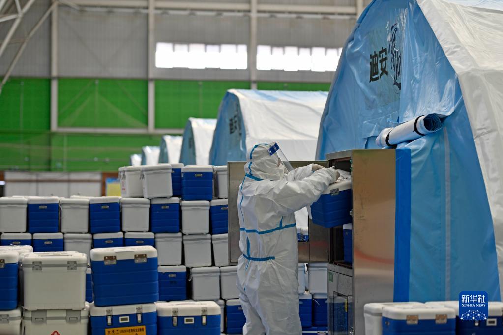 1月13日,工作人员向滨海新区汉沽网球馆内的气膜实验室运送新冠病毒核酸检测样本。