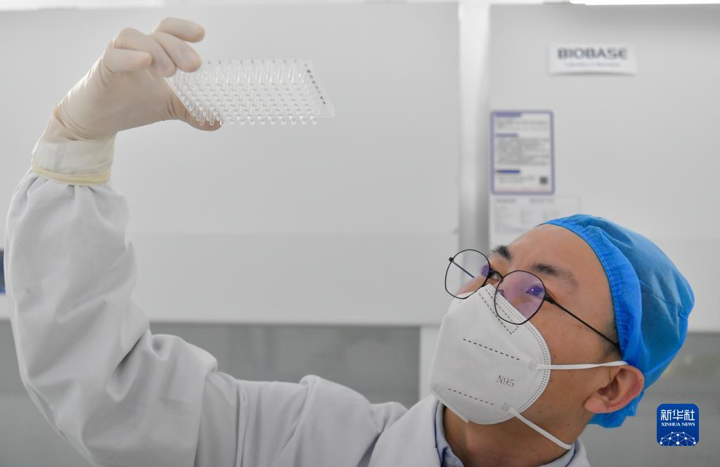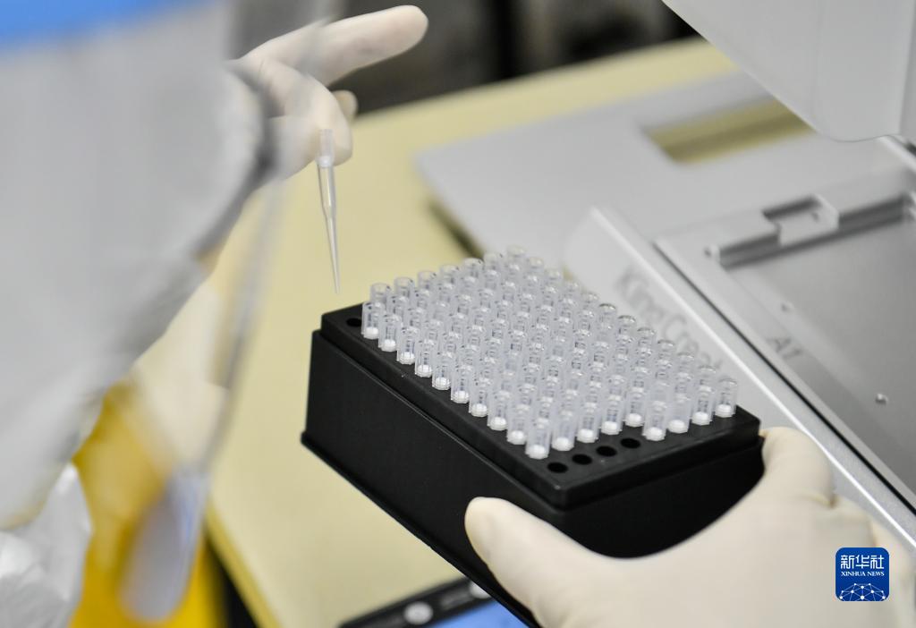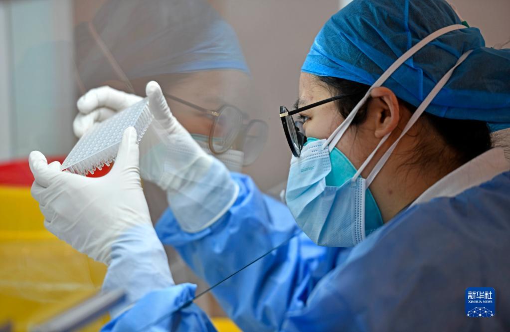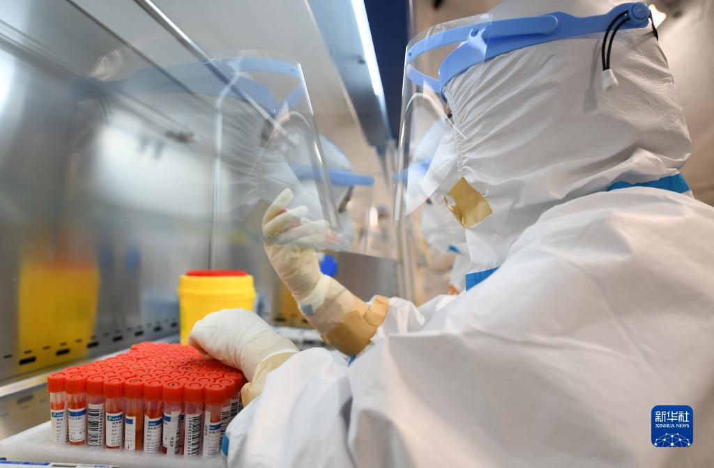 1月13日,在天津市北辰区某高校,气膜实验室工作人员在样本处理区作业。