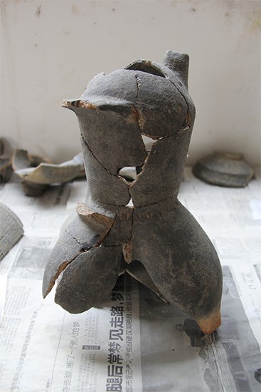 三个扁袋足、顶端还做成了鸟头形象的陶盉。受访者供图