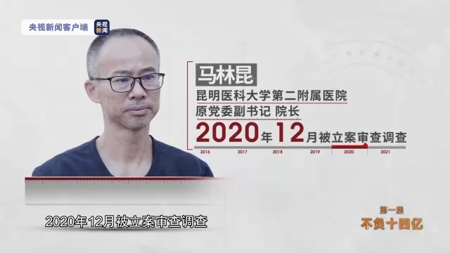 马林昆,昆明医科大学第二附属医院原党委副书记、院长,2020年12月被立案审查调查。云南省纪委监委在开展医疗行业腐败问题和不正之风专项整治过程中,收到了医院职工对马林昆的举报,反映他从医疗器械采购等业务中谋取私利,并最终查证属实。