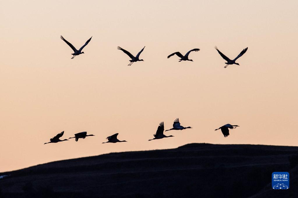 日出时分,黑颈鹤在云南昭通大山包黑颈鹤国家级自然保护区飞翔(1月14日摄)。新华社记者 胡超 摄