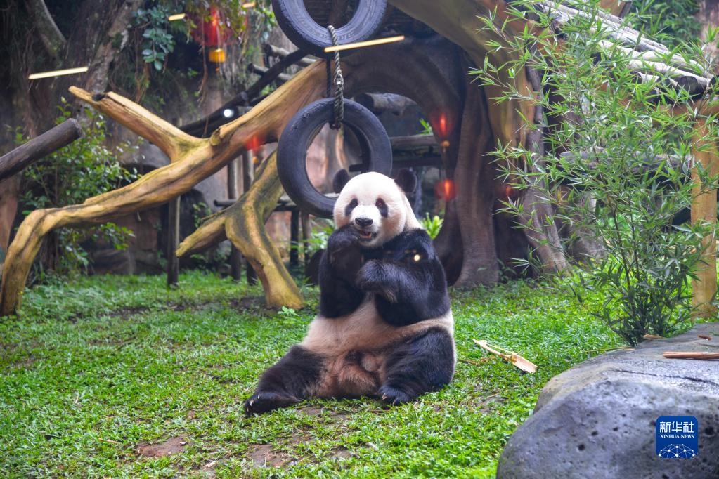 1月21日,大熊猫“彩陶”在印度尼西亚茂物的印尼野生动物园进食。新华社记者 徐钦 摄