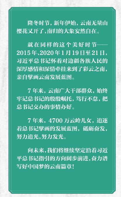 就在同样的这个美好时节——2015年、2020年1月19日至21日,习近平总书记怀着对边疆各族人民的深厚感情和深情牵 挂来到了彩云之南,亲自擘画云南发展蓝图。
