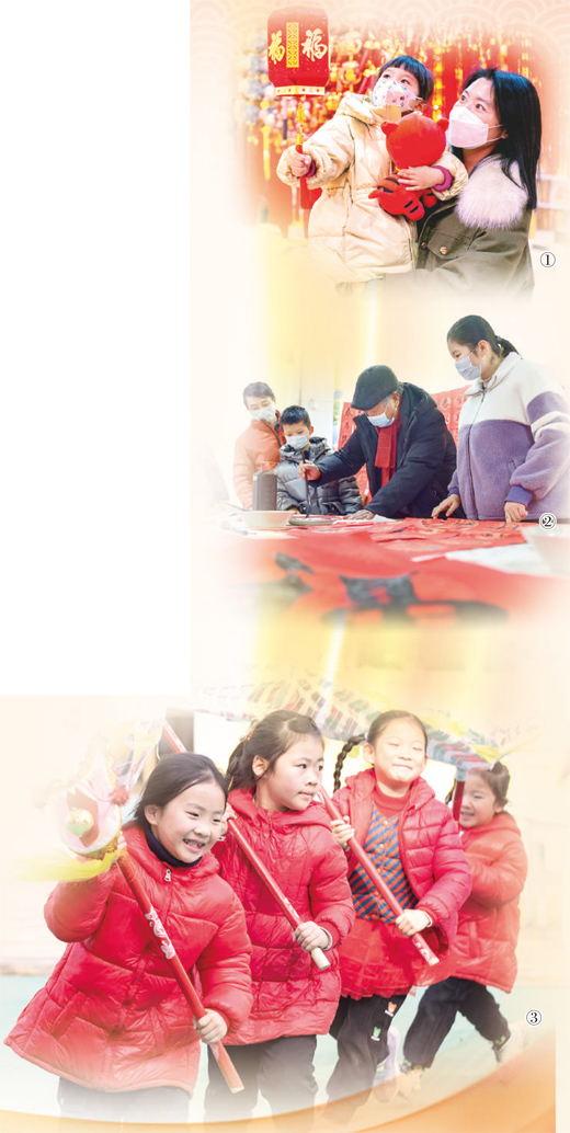 图①:春节将至,内蒙古自治区呼和浩特市市民在选购年货。丁根厚摄。图②:河南省洛阳市涧西区重庆路街道第一社区市民在写春联。黄政伟摄。图③:1月19日,江苏省海安市墩头镇仇湖幼儿园的孩子在舞龙。翟慧勇摄。