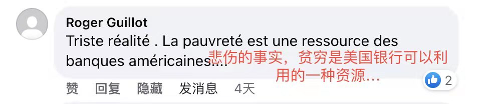 法语脸书网友罗歇·吉约认为,这组报道里提到的,美国在发展中国家收割的案例是“悲伤的事实,贫穷是美国银行可以利用的一种资源”。