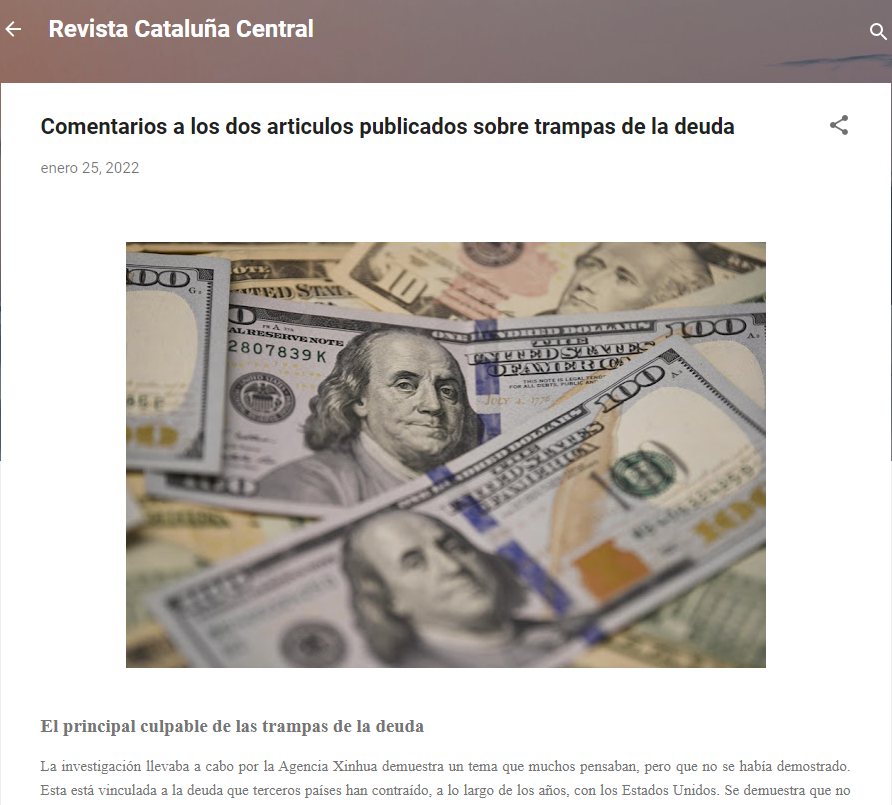 西班牙马雷斯梅数字杂志社长塞萨尔·阿尔卡拉在《加泰罗尼亚中心杂志》的网站中发表对新华社组稿的评论文章(网页截图)