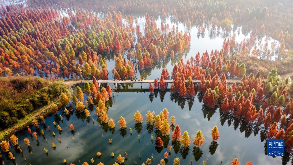2021年12月3日拍摄的武汉涨渡湖湿地公园“水上森林”景色(无人机照片)。