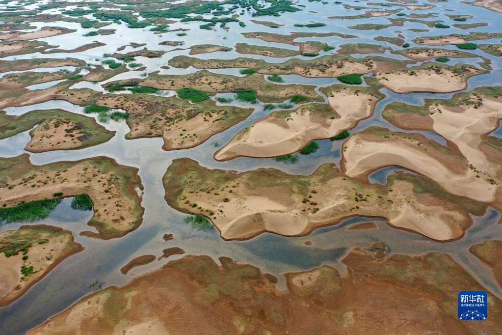 这是在内蒙古自治区鄂尔多斯市杭锦旗巴音温都尔嘎查拍摄的库布其沙漠湿地(2021年7月16日摄,无人机照片)。