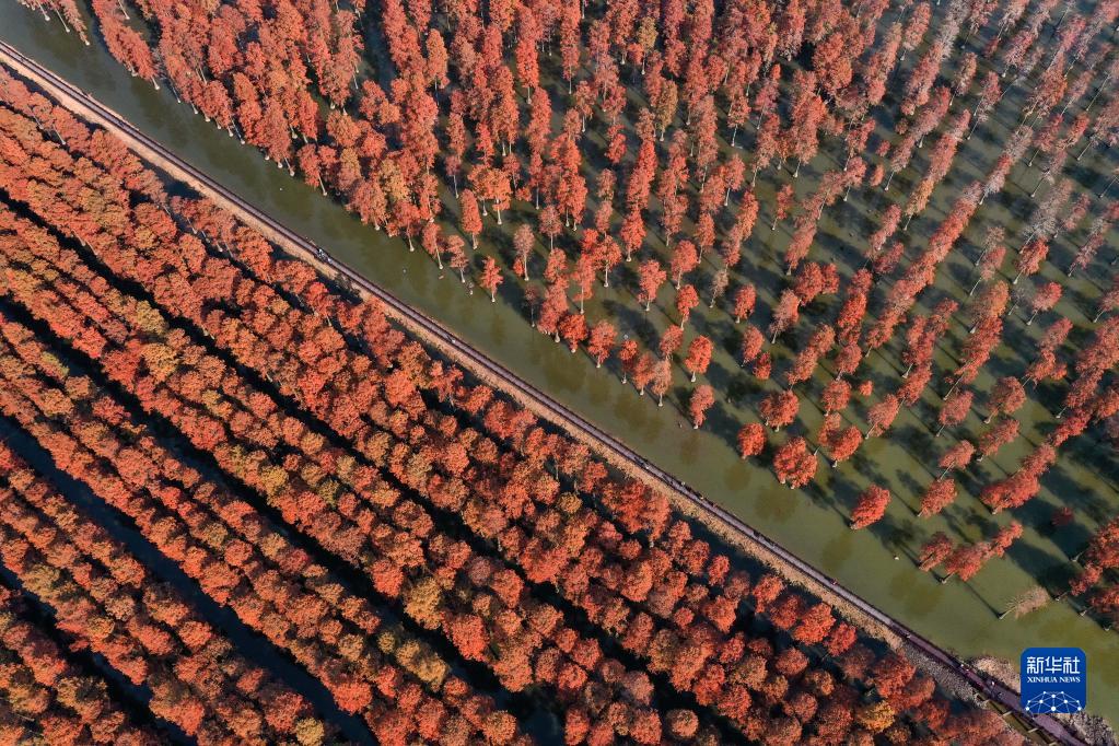 2021年12月10日拍摄的云南省昆明市的甸尾村水杉湿地一景(无人机照片)。