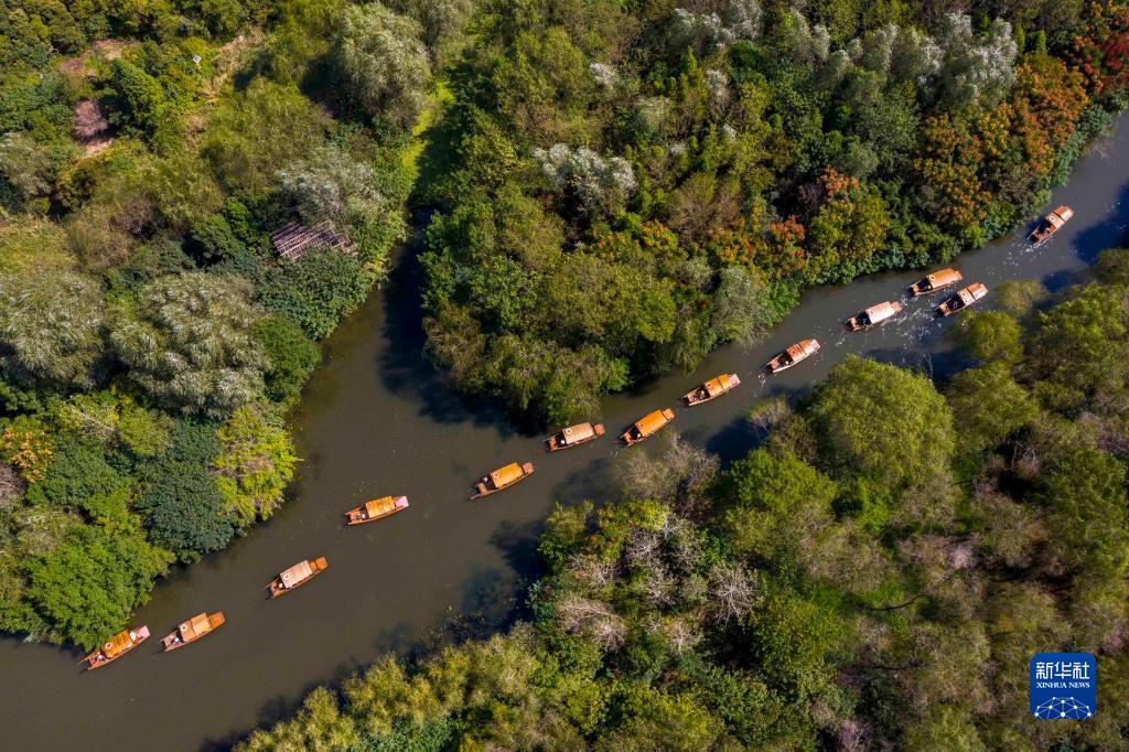 2021年10月3日,游客在江苏省泰州市姜堰区溱湖国家湿地公园乘船游玩(无人机照片)。