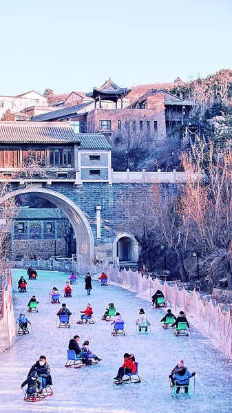 位于北京密云的古北水镇将景区内河道打造成天然冰场,游客在这里体验丰富多彩的冰上项目。陈永利摄/光明图片