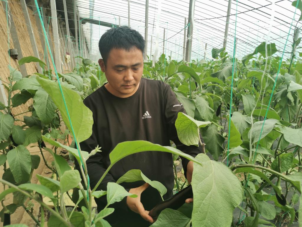 王聪在大棚里打理茄子。(新华社记者张力元 摄)