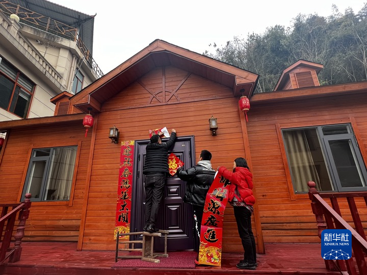 1月28日,莲花池村村民陈仁一家在贴春联。新华社记者邓楠 摄