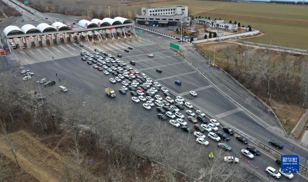 2月6日,车辆在河北省石家庄市石家庄南收费站通行(无人机照片)。新华社发(许建园 摄)