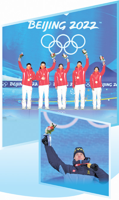 下图:自由式滑雪男子雪上技巧运动员、瑞典选手瓦尔特·瓦尔贝里在张家口颁奖广场奖牌颁发仪式上。