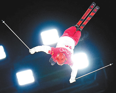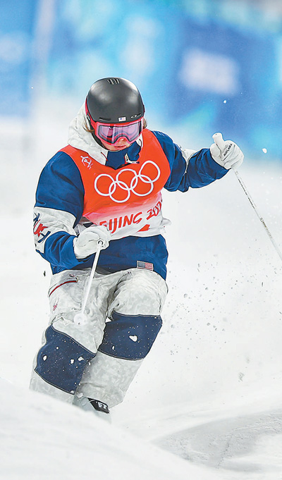 2月6日,获得亚军的美国选手杰琳·考夫在比赛中。当日,自由式滑雪女子雪上技巧决赛在张家口赛区云顶滑雪公园进行。