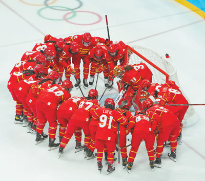 2月6日,中国队球员赛前互相加油。当日,在五棵松体育中心进行的女子冰球小组赛中,中国队以2∶1战胜日本队。