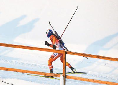 2月5日,中国选手孟繁棋在比赛中。当日,冬季两项混合接力4×6公里比赛在国家冬季两项中心进行。
